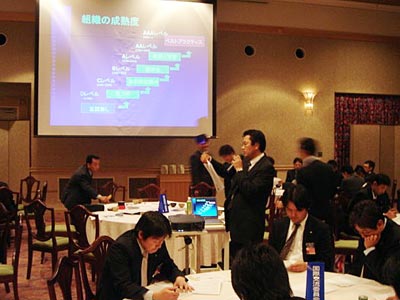 「経営品質」をキーワードに講義を受けたが、今回は導入ということで、経営品質基準(リーダーシップから始まる8つのカテゴリー)を、簡易セルフアセスメントシートを使って、会員が自身の会社の組織の成熟度を測った。