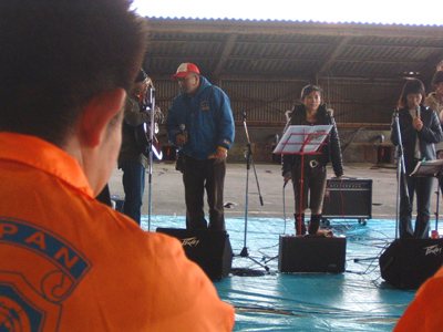 「前日夜からの雷雨により、カッターレースも中止になり、われわれも急遽、徳山魚市場で凧づくりと わたぼうしライブコンサートをおこなうことになりました。
